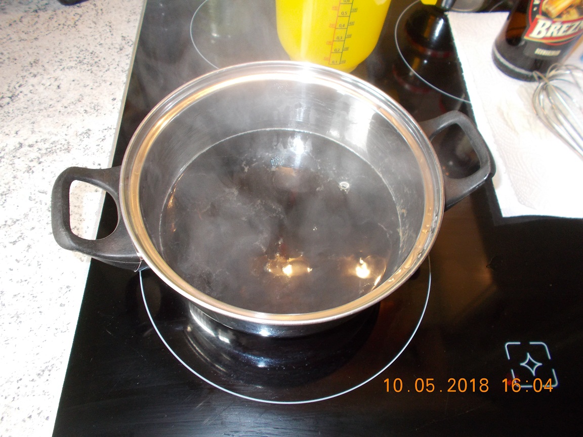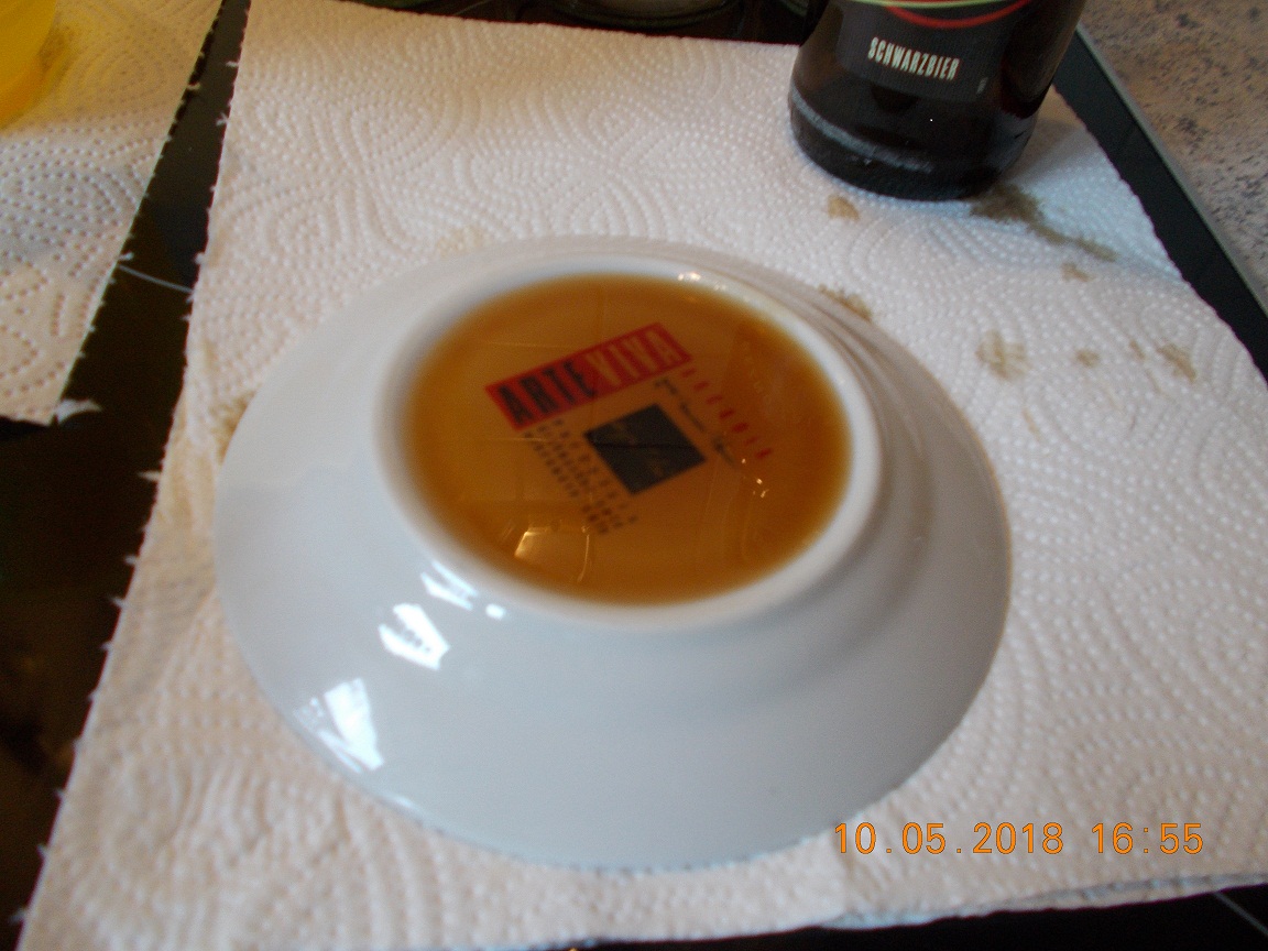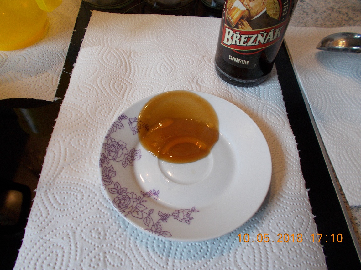 dann das heiße Bier in ein Messbecher geben und wieder soviel Wasser dazu geben das wir