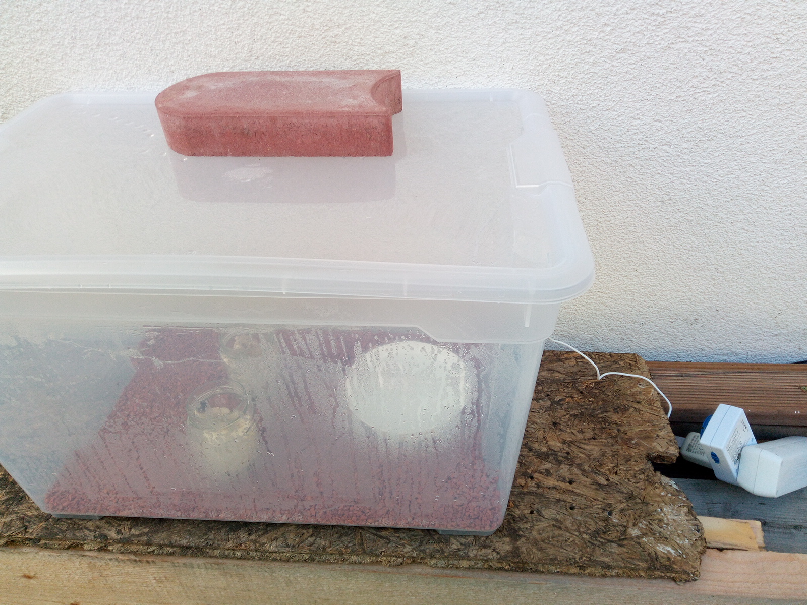 für die Feuchtigkeit soll ein kleiner Vernebler in einem Wassergefäß in der Kiste sorgen: