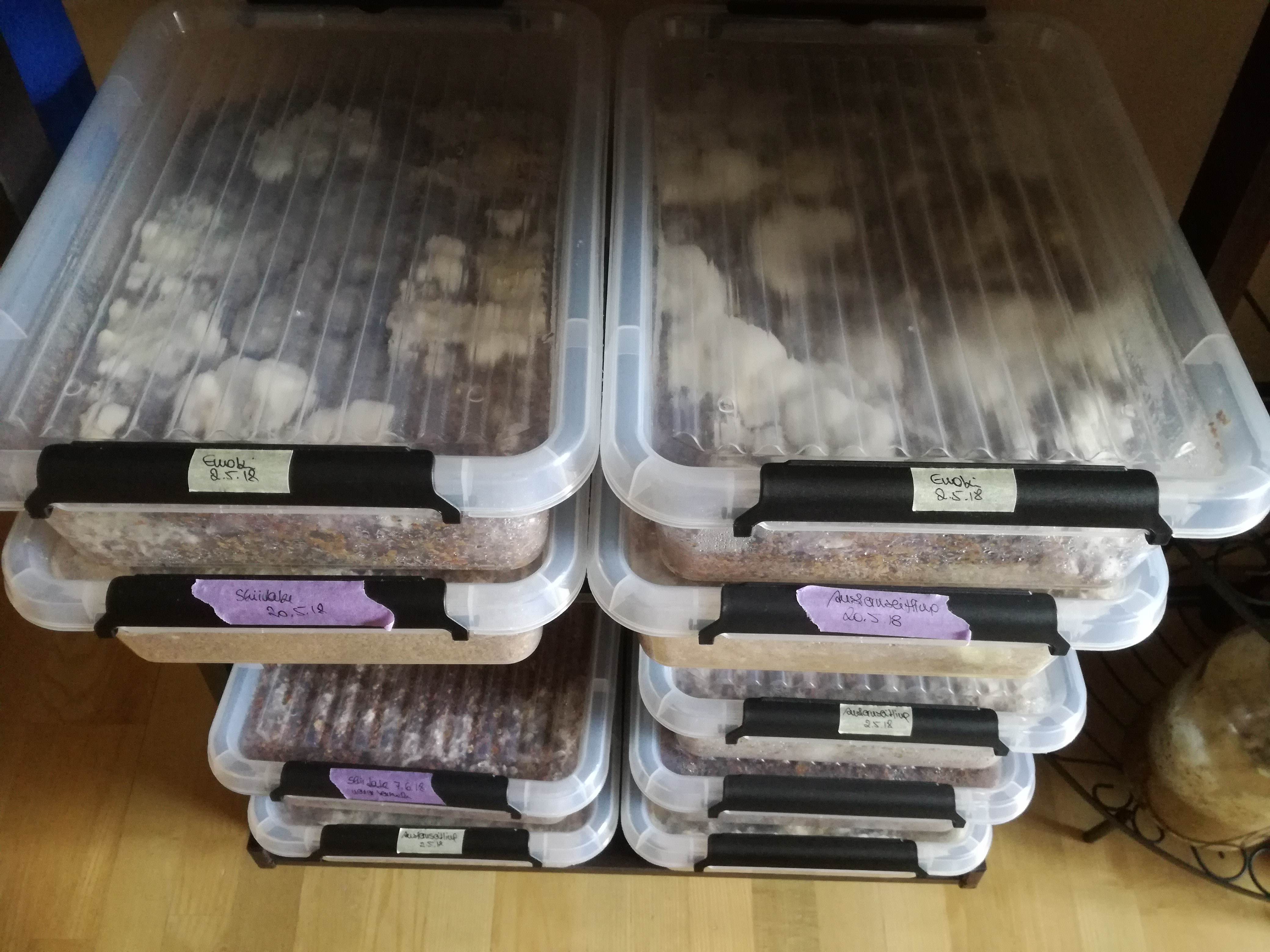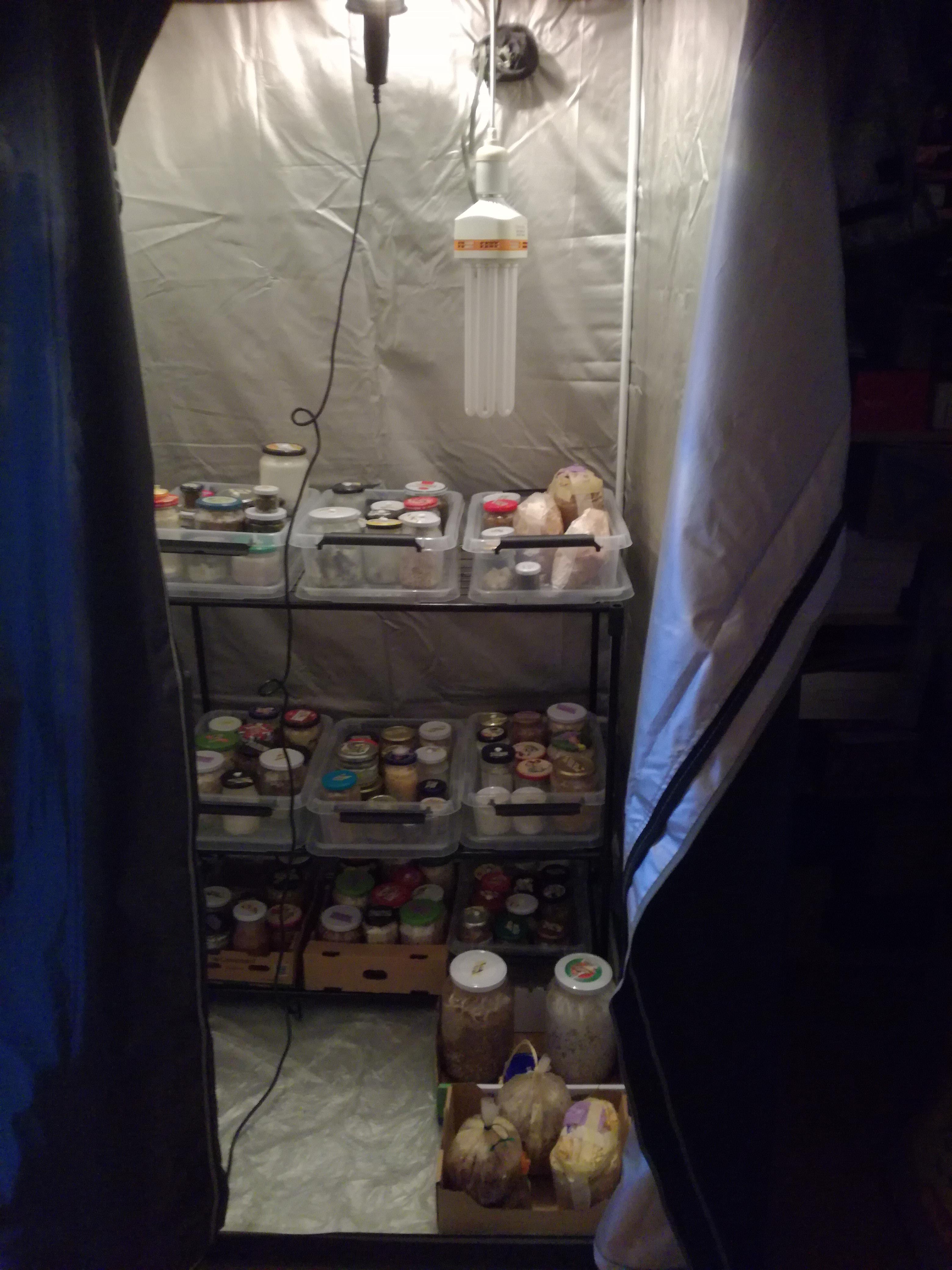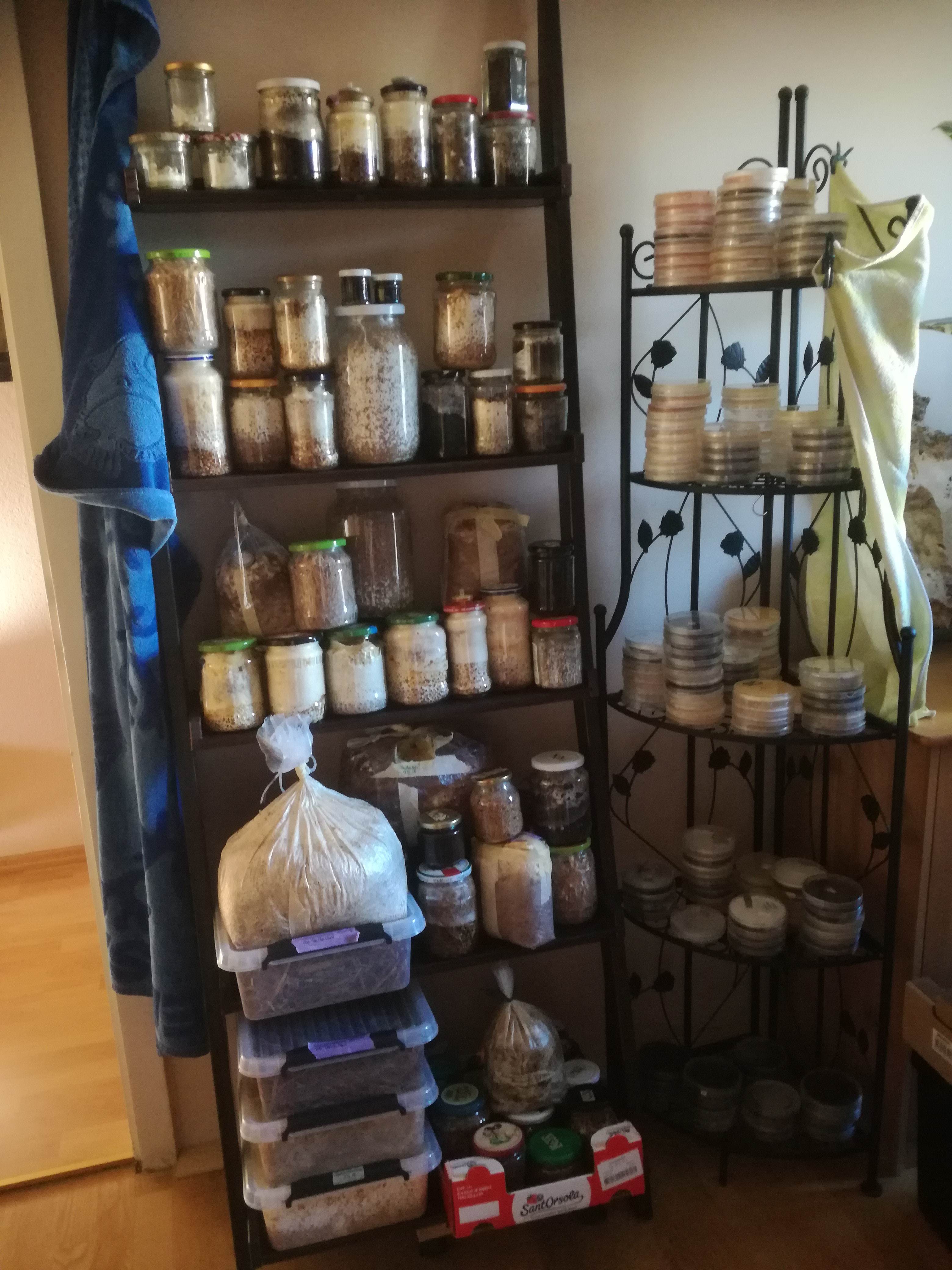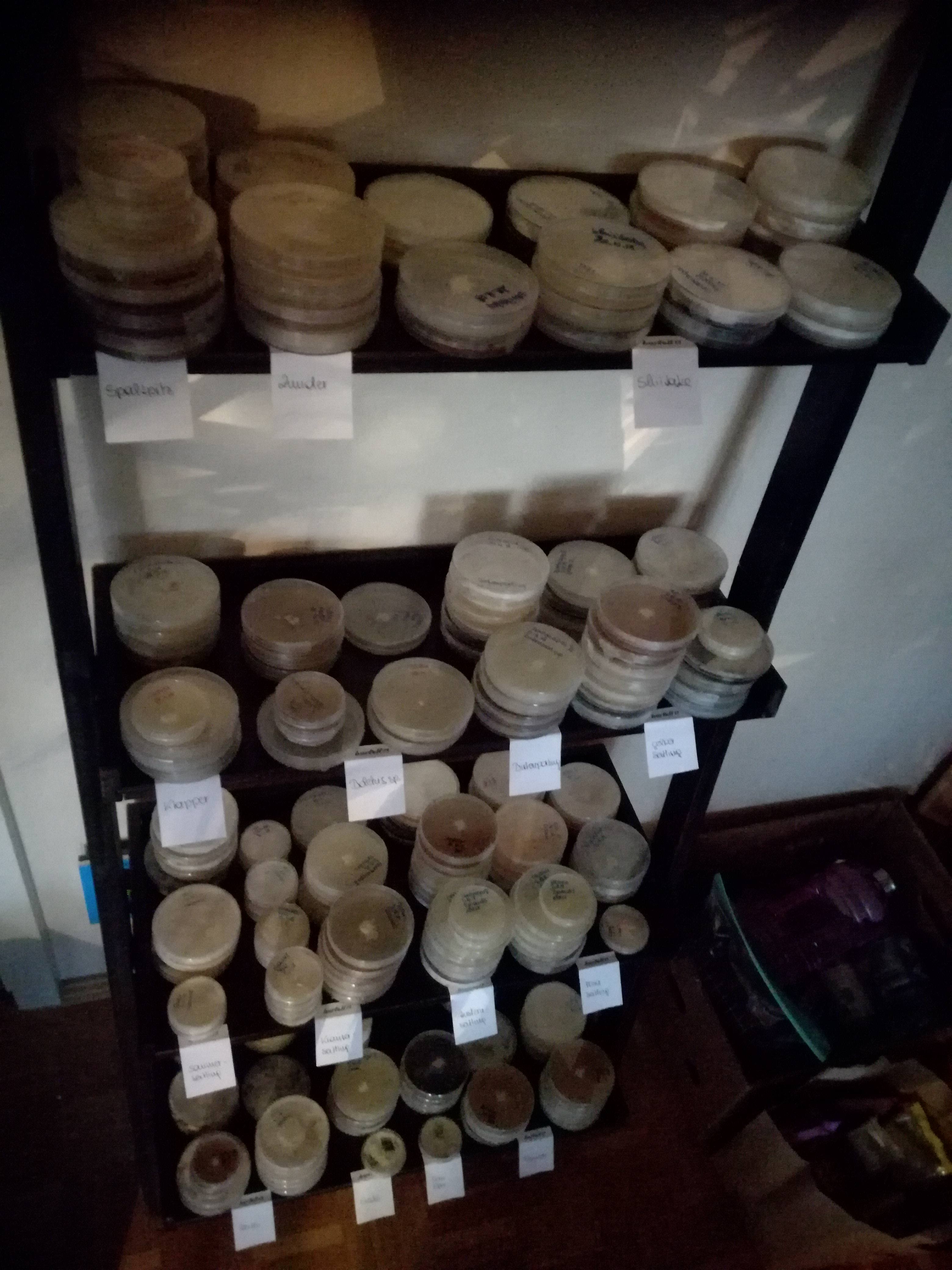 Ich hänge mal ein paar Fotos dazu, damit man einen Überblick bekommt, womit ich mich im Moment beschäftige. Sind derzeit rund 17 verschiedene Reinkulturen am Start mit denen Mediengrundlagen- und Substratoptimierungsversuche durchgeführt werden...