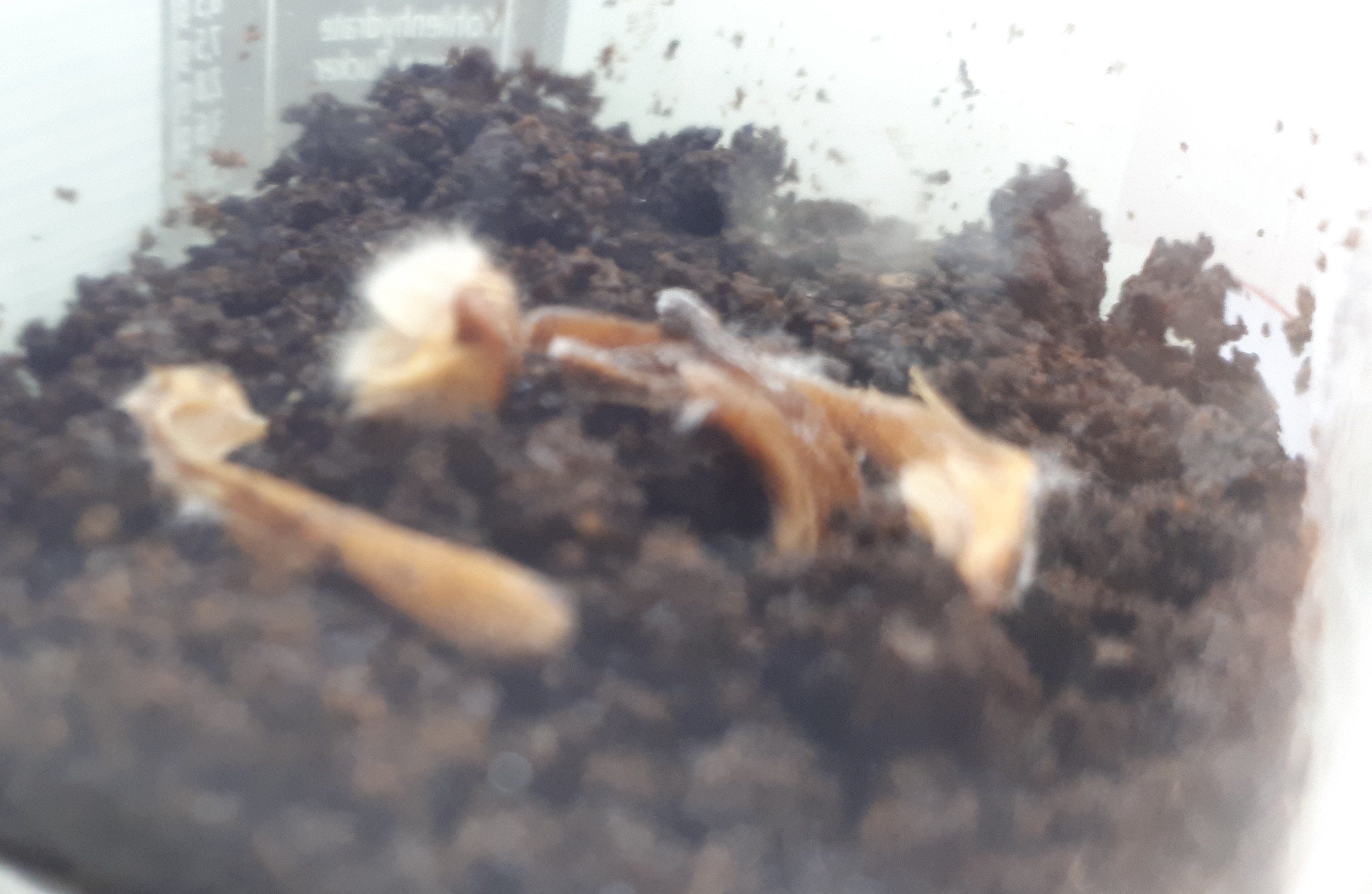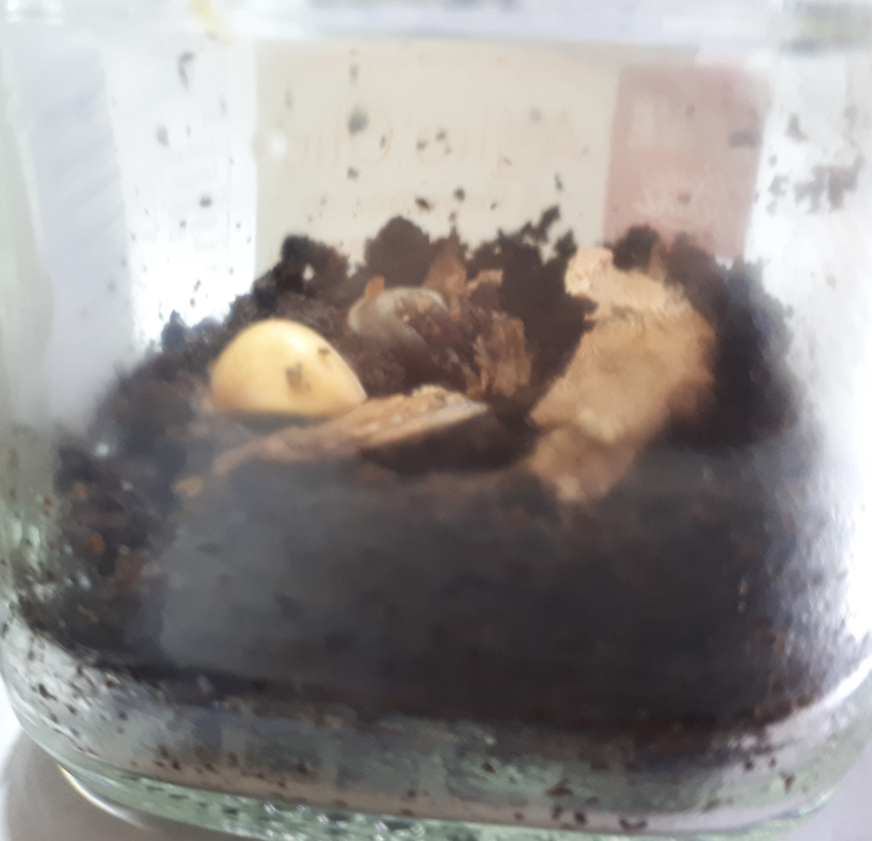 Das im Kaffesatzglas (wohl der Pilzhut) sah für mich auf den ersten Blick aus wie eine Knoblauchzehe.