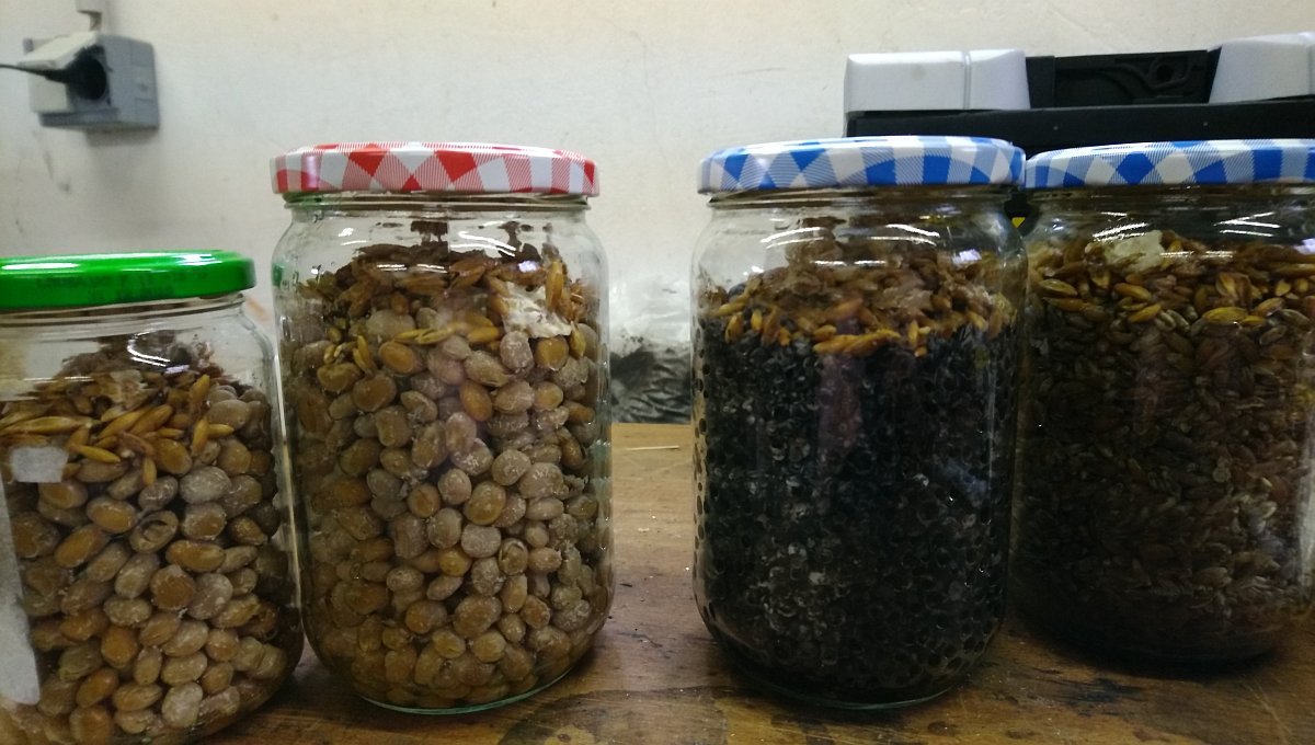 Ein Problem das ich hatte was das Wasser bei den Leguminosen. Nach dem Sterilisieren sah es ganz gut aus. Nachdem ich beimpft und geschüttelt hatte, war auf einmal ein jede Mene Flüssigkeit im Glas. Mittlerweile hat sich das normalisiert. Evtl. lag es auch an der niedrigen Temperatur von 1 bis 2 °C beim Beimpfen. Könnte mir vorstellen, dass durch das wärmer werden die Flüssigkeit wieder aufgenommen wird.