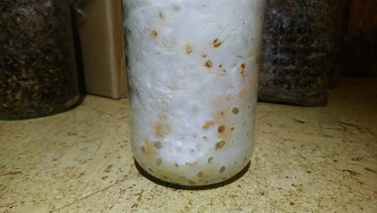 Ich hatte beim letzten Sterilisieren mal ein Glas Ackerbohnen mitgekocht und mit vorhandener Austernkörnerbrut beimpft. Die hat sich willig ausgebreitet. Leider war mir das Gas für den Brenner ausgegangen und so wurden die Körner wohl nicht durcherhitzt... Die anderen Gläßer aus der Charge sahen genau so aus.