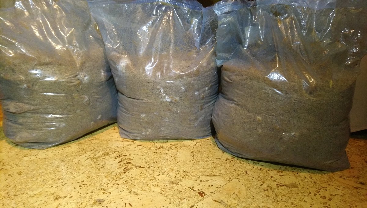 Der eine Beutel links macht zwar ganz langsam was aber ob das noch wird? Riechen etwas seltsam. Tun die Strohpellets aber so oder so. Schon anders als frisches Stroh.