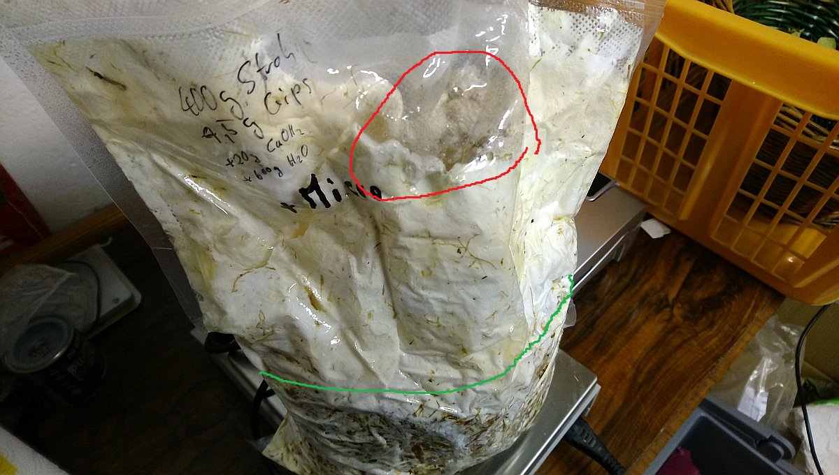 Auf dem 3. Foto sieht man die Primordienbildung am Mycel recht weit oben im Sack.