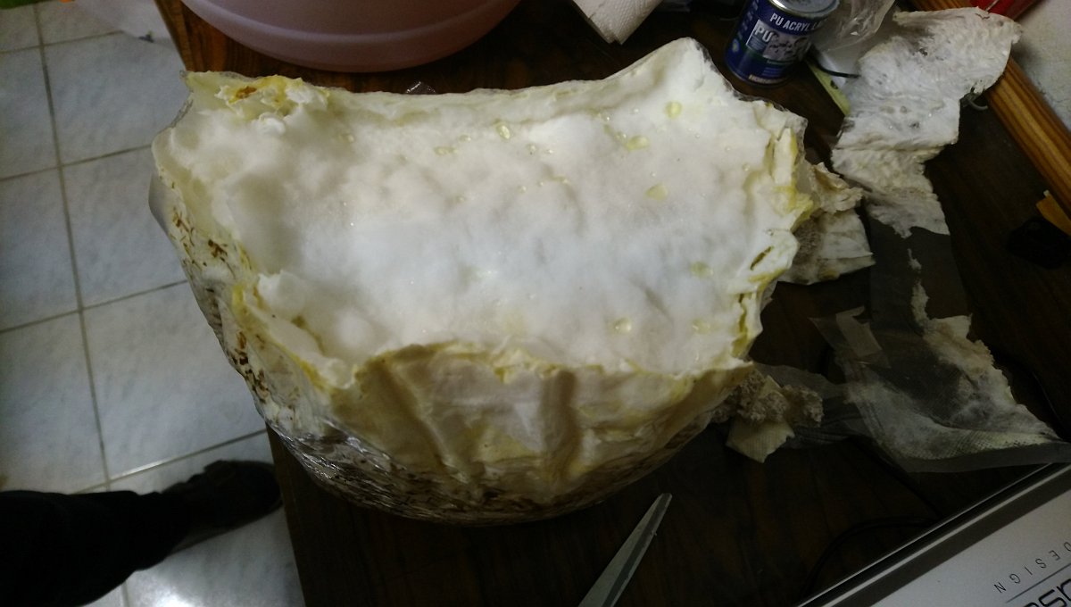 So, nun wollen die drei eigensinnigen Dinger nicht an den Einschnitten fruchten sondern am höchsten Punkt im Sack, da wo das Mycel am Beutel innen hochgewachsen ist, also ca. 15 cm über dem eigentlichen Substrat.