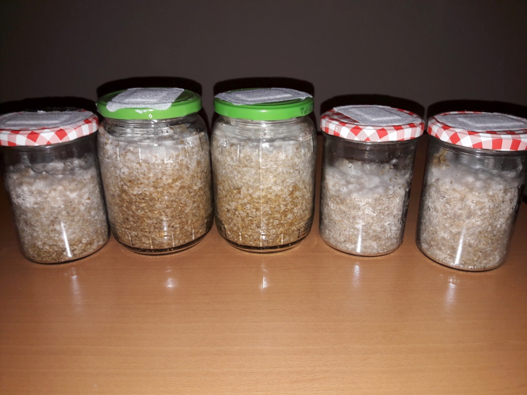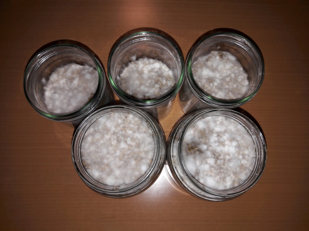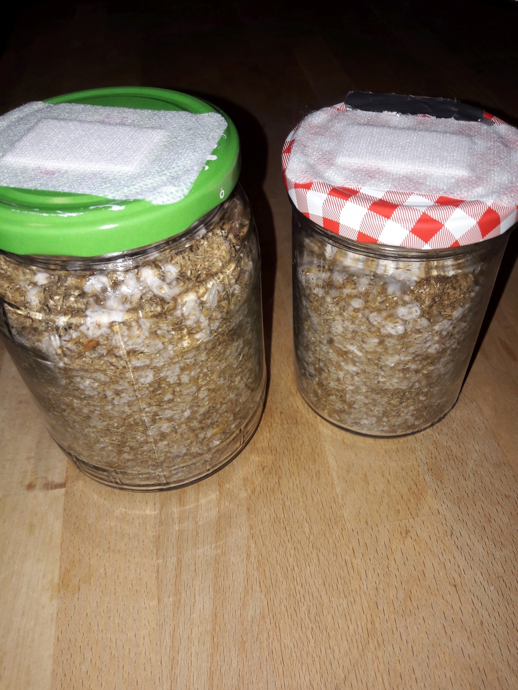 Funktioniert bislang super. Schon nach einem Tag ist Myzelwachstum zu erahnen, nach zwei Tagen ist es offensichtlich. Ich habe 3 kleine (435ml) und zwei größere Gläser gefüllt (siehe Fotos). In den größeren Gläsern ist das Wachstum besonders im unteren Bereich nicht so gut wie in den kleinen. Vielleicht liegt es an der Größe, vielleich habe ich das Substrat zu sehr verdichtet. Da das Strohpelltsubstrat sehr locker ist, habe ich die Gläser beim Befüllen mehrfach mit dem Boden auf den Handballen geschlagen, um es zu verdichten.