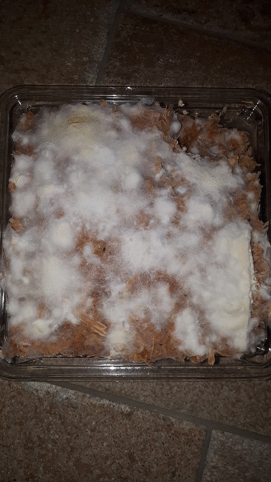 So habe ich vor 13 Tagen auf unsterile Art und Weise etwas Kleintierstreu mit Körnerbrut des Austernseitlings angesetzt.