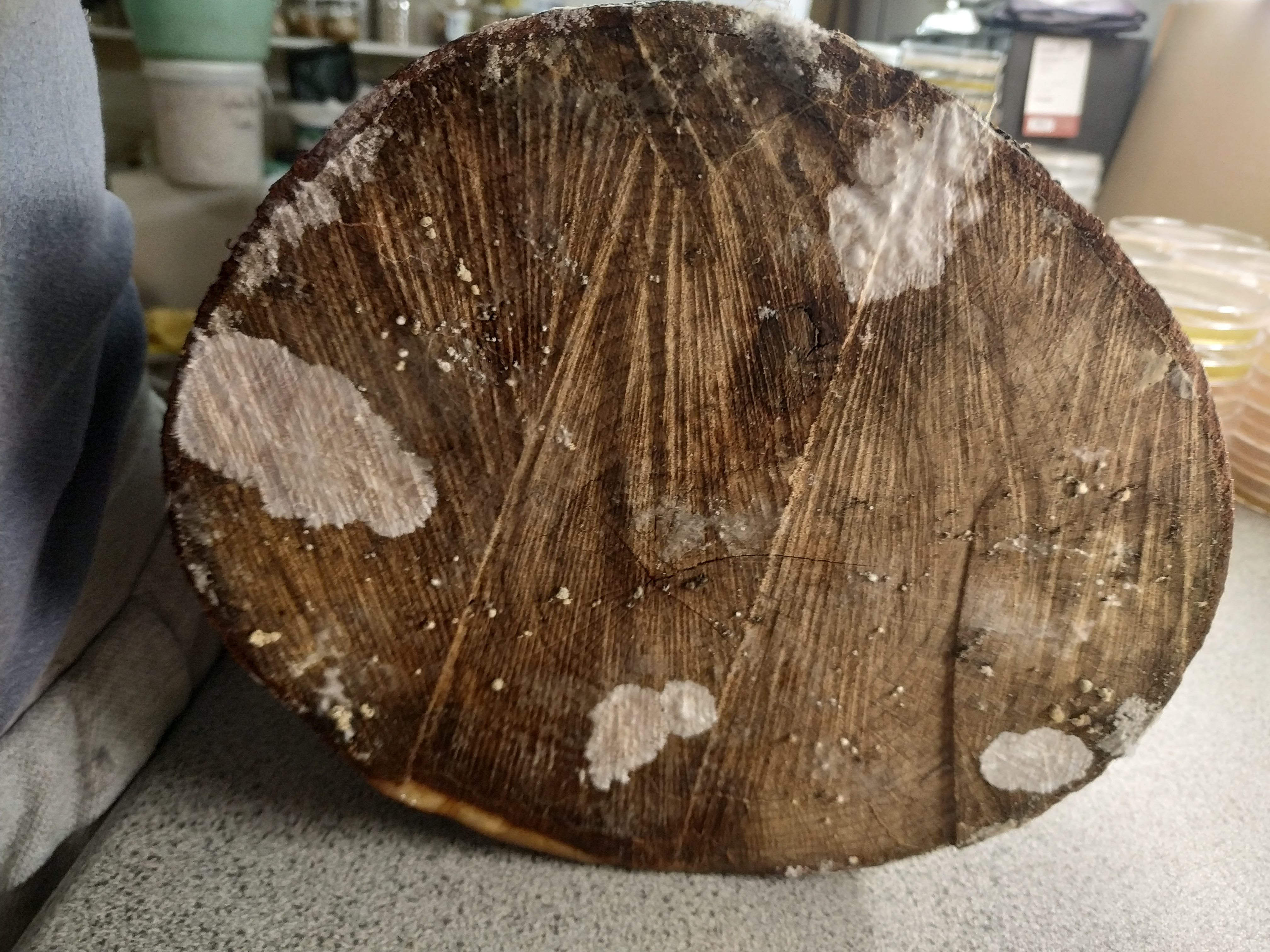 Ich stelle heute mal eine mykologische Grundfrage, die mich schon das ein oder andere mal beschäftigt hat und die ich an dem Bild ganz gut erläutern kann. Bei dem Buchenstämmchen sieht man ganz schön wie das Wachstum aus den Dübeln heraus durch das Holz stattgefunden hat und Mycel an der Stirnseite austritt. Noch sind die vier Mycelflecken (von 4 Dübeln) voneinander getrennt, aber spätestens, wenn das Holz mal in Erde steckt werden die sich vermutlich vereinigen und und einen einzigen Pilz bilden.