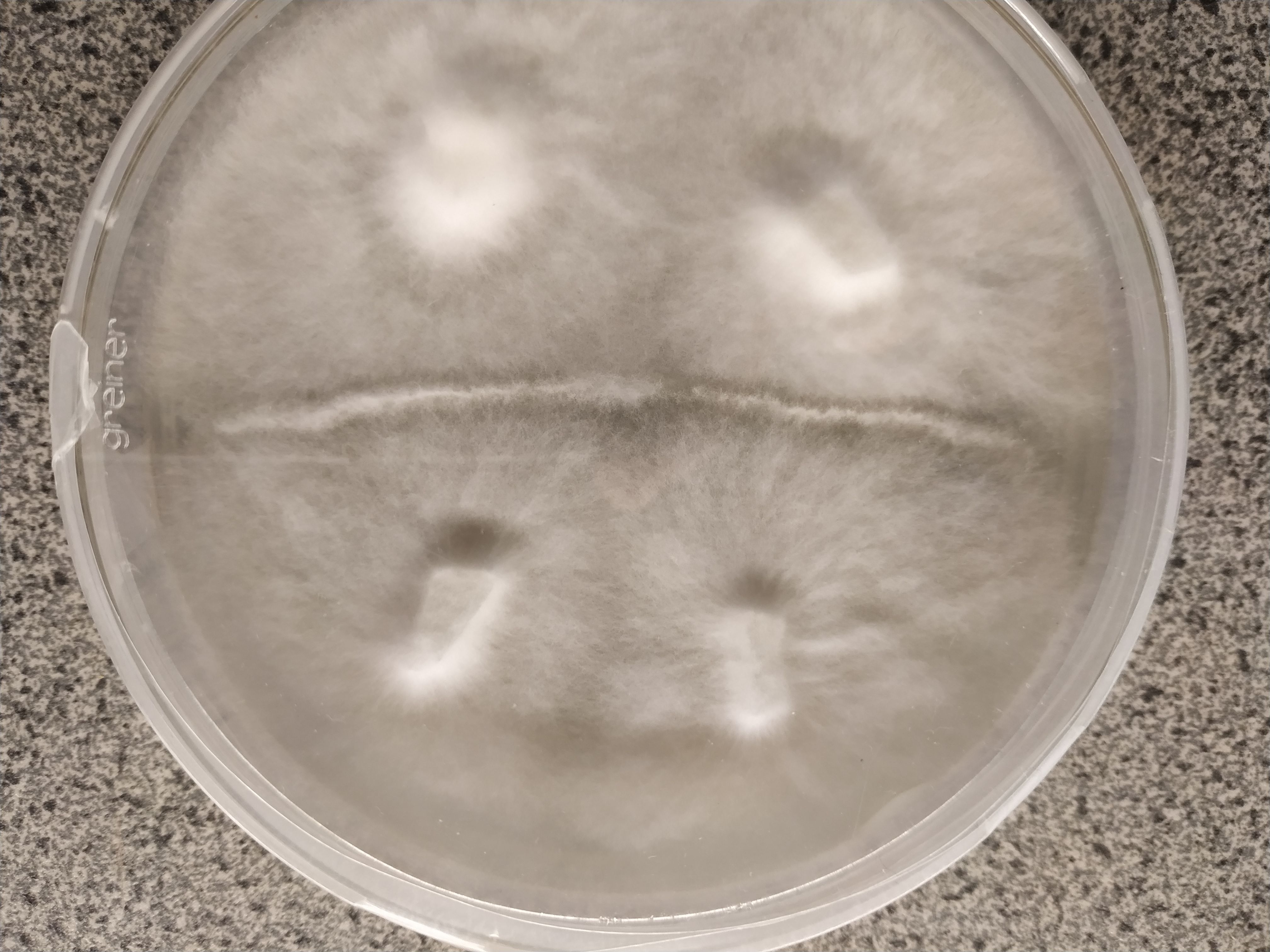 Oben zwei Agarstückchen von Stamm A und unten 2 Stückchen von Stamm B. Während die beiden Stücke eines Stammes schön ineinander wachsen bildet sich zwischen A und B ein Strich, quasi wie eine Wand zwischen den beiden Stämmen... was da wohl vor sich geht?