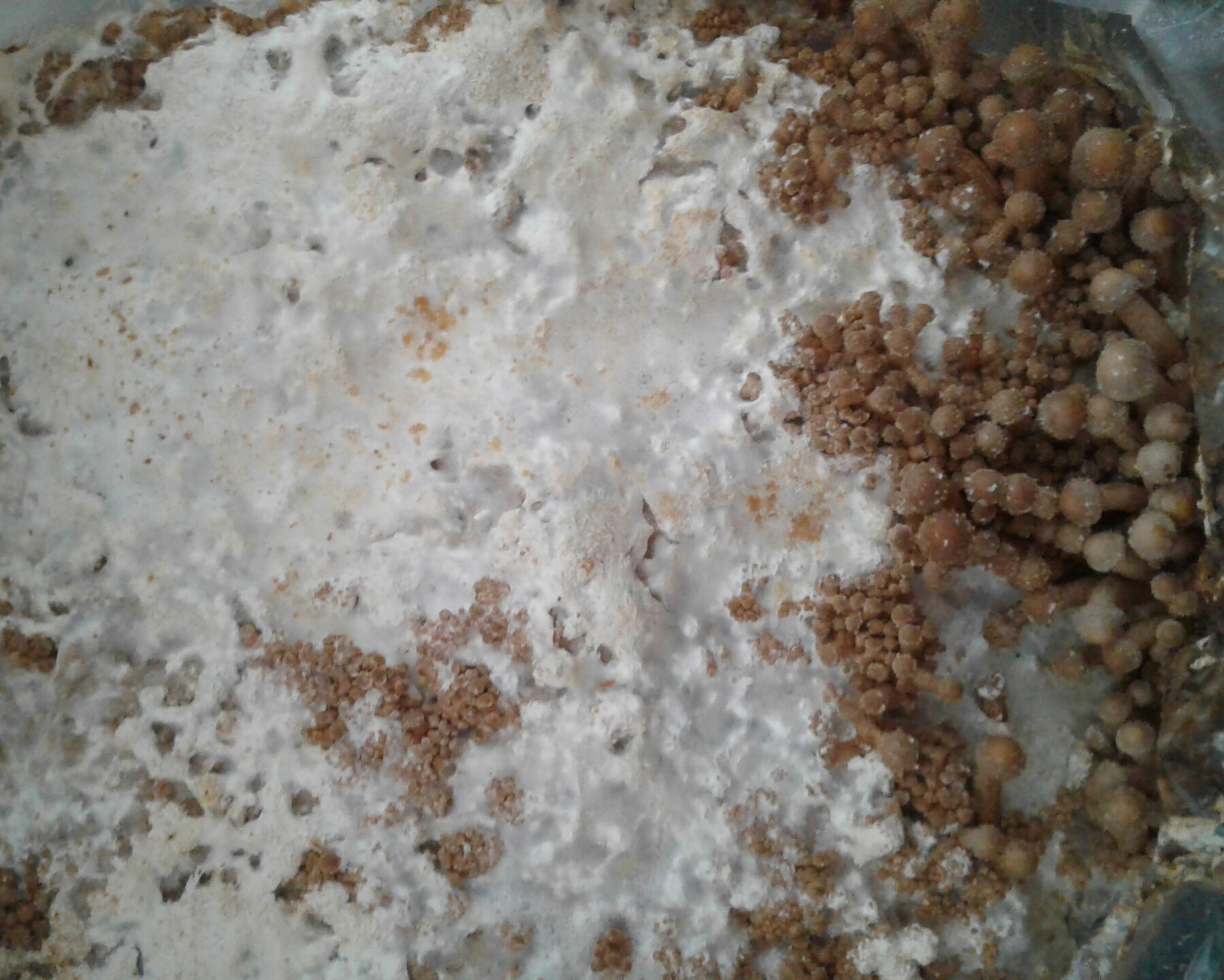 diese konti stört mich deswegen so, weil sie aussieht wie eine ks Kultur die anfängt Primordien zu bilden. Ich glaube ich hatte das schon mal. Auf der Stockschwämmchenkultur kann man die konti aber viel besser ausmachen. Preisfrage: was ist das?
