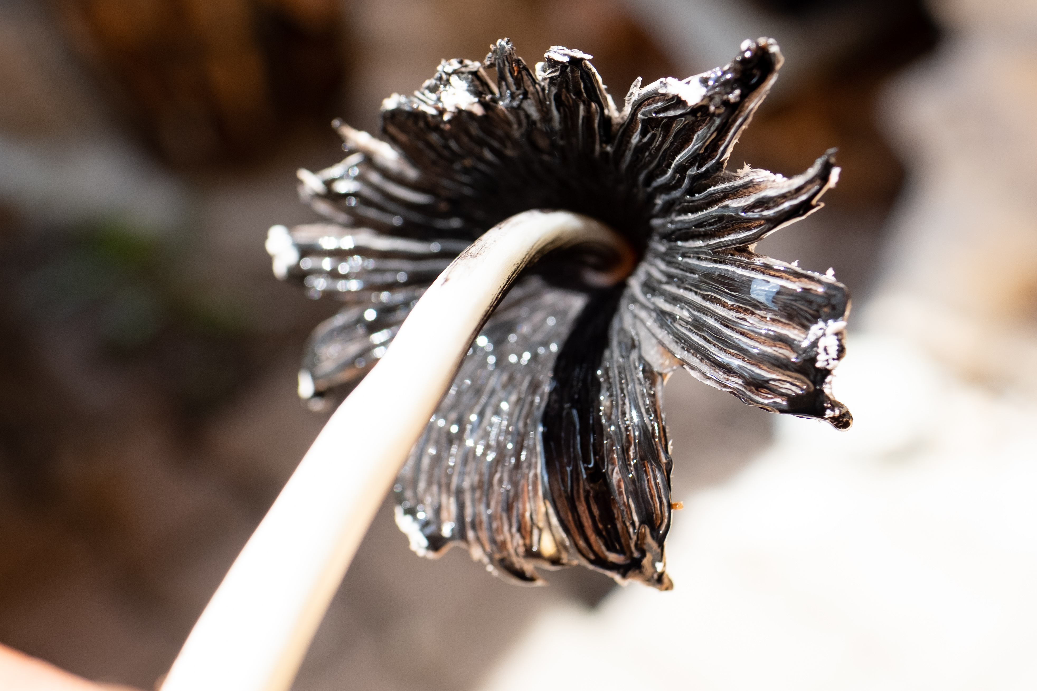 Gestern waren die Hüte noch alle geschlossen und ich hatte keine Ahnung was das denn für Pilze sind, innerhalb eines Tages ist einer der Pilze dann richtig losgeschossen. Als ich die schwarzen nassen Lamellen gesehen hab, dachte ich direkt an Tintlinge, auch wenn ich mich nie ansatzweise damit beschäftigt hab. Aber wenn man das sieht, begreift man sofort warum die so heißen...