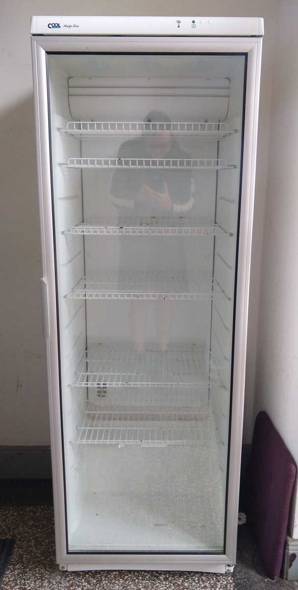 Zufällig stand da ein Kühlschrank mit Glastür 'rum. Der wird zwar noch gebraucht, brachte mich aber auf die Idee, so ein Teil in einen kleinen, mobilen Fruchtungsraum zu verwandeln, bis es eine Alternative gibt. Ein ähnliches Modell könnte ich evtl. organisieren, Recyclinghof der gleichen Firma ist fast nebenan