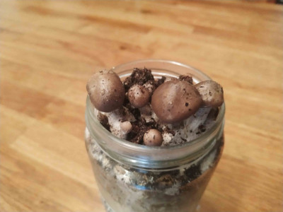Seit dem 26.08. steht das kleine, gut durchwachsene Gläschen nun bei 15°C und am 12.09. habe ich die ersten kleinen Mini-Pilzchen entdeckt. Nun sind die Kleinen schon etwas größer und es zeichnet sich ab, dass dem Pilz mein Fruchtungsraum nicht ganz so gut gefällt - der Kopf ist mir deutlich zu klein...
