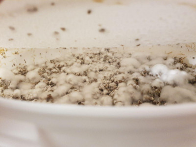 Zudem habe ich noch etwas zu viel Feuchtigkeit im Eimer, die ich nach und nach über einen Stopfen am unteren Rand ablasse. Auch vermute ich, dass das Material stärker verdichtet gehört.