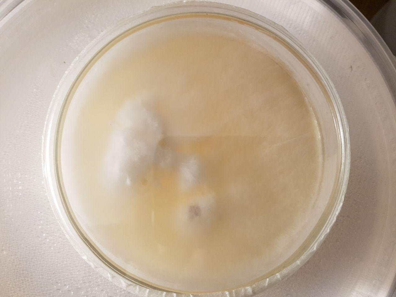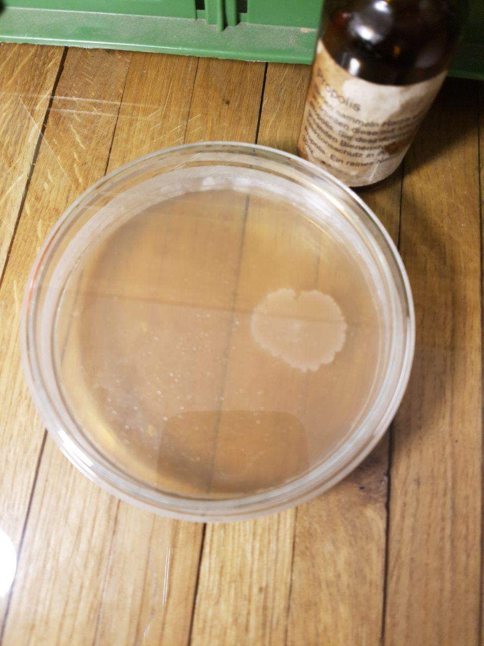 Mein Eindruck ist, dass beim Sterilisieren zu viel Wasserdampf in die Petrischalen eindringt. Auf den Bildern weiter unten ist viel Kondenswasser zu sehen. Zudem tue ich mir schwer damit, dass ich keine richtig sterile Arbeitsumgebung herstellen kann. Ich arbeite unter einer Art Haube, die ich auf eine Glasplatte stelle, als improvisierte ImpfBox. Die wird ausgenebelt und desinfiziert aber der begrenzte Platz und das Gefummel unter der Haube wirken noch ziemlich unbeholfen.