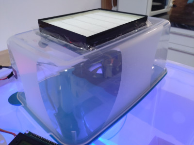 Der Lufteinlass ist erfolgt über eine Tupperdose in die ein Staubsauger Hepafilter eingesetzt ist. Im Deckel der Tupperdose ist ein 10cm Loch eingesägt in welchem ein weiterer Kanalverbinder eingeklebt ist ( Stutzen nach außen bzw. unten) Am Kanalverbinder ist ein 120mm PC Lüfter angeschraubt welcher die Luft durch den Filter saugt und nach unten in die Box bläst. Der Tupperdosen Filteraufsatz ist über den Stutzen in das Lufteinlassloch der Box eingesetzt, ist also abnehmbar.